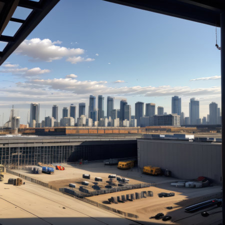A modern industrial warehouse showcases advanced robotics and automation technology, highlighting efficient operations in a well-lit urban environment.