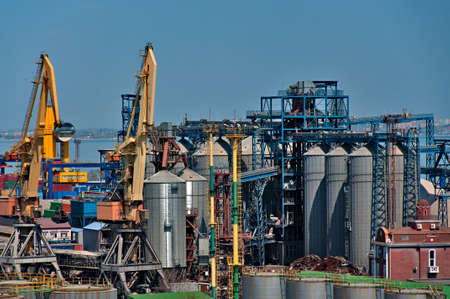 Top view on industrial site with heavy machinery, storage houses and cranes