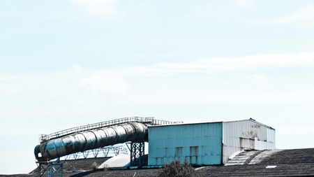 Conveyor belt for feeding sand, gravel and silo or tank for storing and protecting feed, grain or cement from water and air in an industrial area.