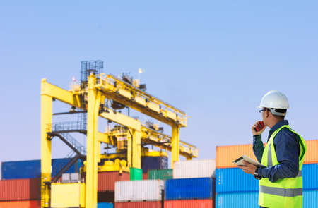 team engineer he is working in container box yard area of logistics transportation import export or shipping industry