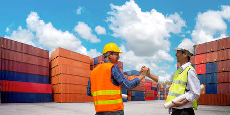 Industrial worker works with co-worker at overseas shipping container yard . Logistics supply chain management and international goods export concept .