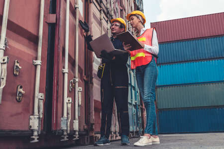 Businesswoman and engineer talking and checking loading Containers box from Cargo freight ship for import export. shipping in docks.