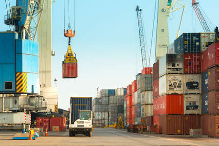 Santos, Brazil, 11, April 2013: A Hamburg Süd Container on the delivery truck at container terminal in port of Santos.