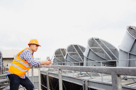Asian male engineer inspecting pipe fittings and chillers, refrigeration plant refrigeration plant in factory. male mechanic wearing helmet and Reflective Safety Vest uses laptop, tablet, equipment with sets of cooling towers in conditioning systems background.