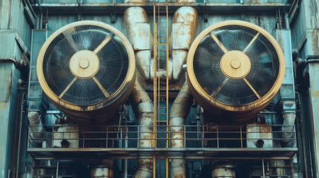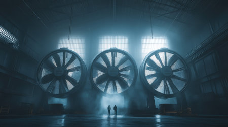 This image showcases large industrial ventilation fans set against a modern structure, highlighting dynamic lines, intricate machinery, and atmospheric lighting.