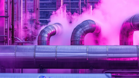 A close-up view of metallic pipes in a factory setting, surrounded by swirling steam and illuminated by colorful lighting, showcasing industrial design.