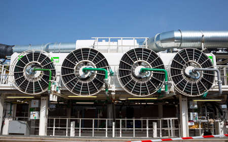 Industrial fans for air conditioning. Dirty air conditioner works behind a metal grate.