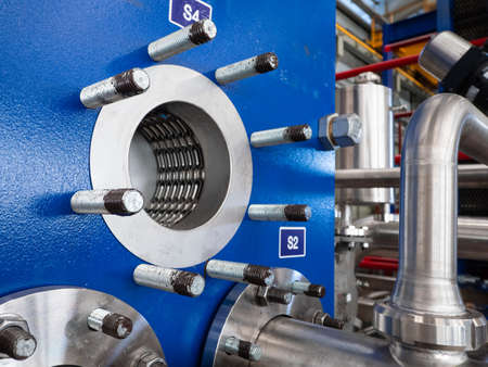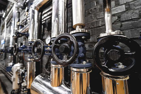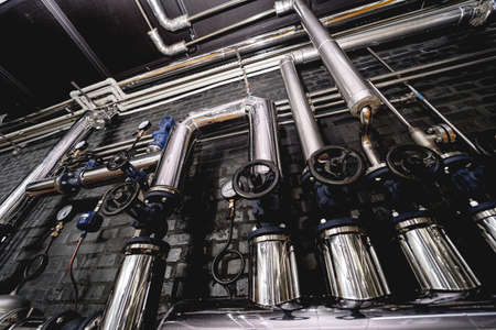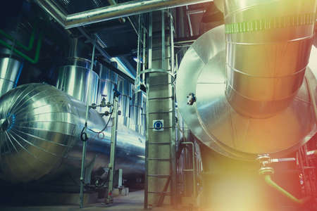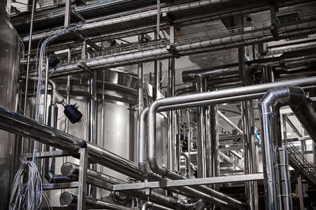 Steel pipes and tank for wort boiling at beer factory - brewery equipment. Production, manufacture, industrial concept