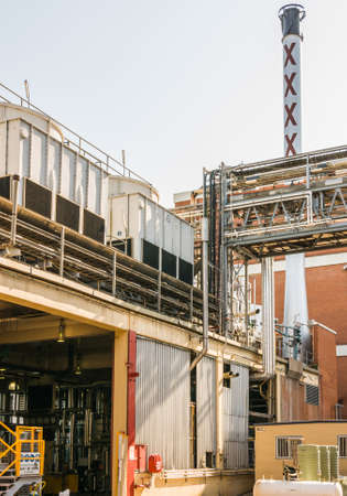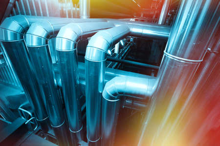 Industrial Factory. Various mechanisms and metal pipes. Toned image. Motion blur effect.