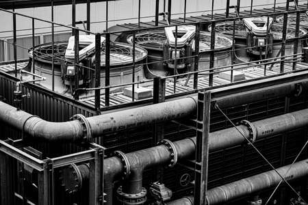 Equipment, cables and piping as found inside of a modern industrial power plant b&w