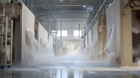 An industrial facility showcasing a cleaning process with steam and foam in a spacious production area. The modern interior highlights technology and sanitation.