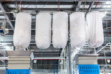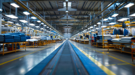 This image captures the expansive interior of a textile factory, showcasing an organized production line filled with machinery and equipment used in fabric manufacturing.