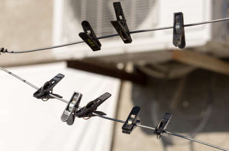 Colorful faded retro vintage background of lines of towels hanging with colorful clips , dark nostalgic mood