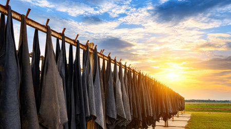 Textiles hang drying outdoors, arranged in rows against a scenic backdrop. The image features textiles in varying shades, illuminated by warm sunlight. The composition is a wide shot with a clear sky, and it may be suitable for commercial applications related to production and manufacturing.