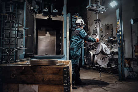 Worker in helmet is putting freshly made metal weight to the storage at metal factory.