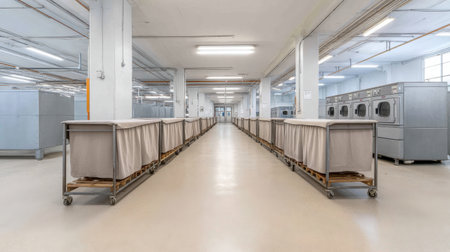 A spacious and clean industrial laundry facility featuring rows of trolleys and machines, illuminated by bright lighting, showcasing a modern and functional design.