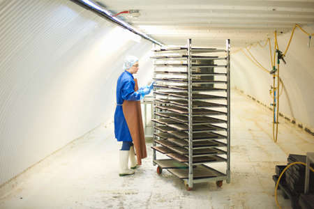 Worker wearing hair net, rubber boots and apron pushing trolley through corridor