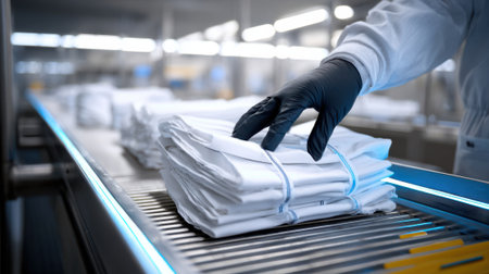 Staff member handling bundled linen detected by RFID system on conveyor belt highlighting seamless integration of smart textile tracking in cleanroom environment.
