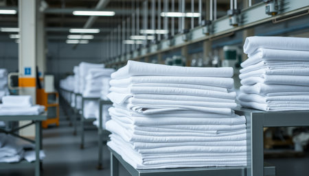 a commercial laundry plant, where mountains of linens undergo the meticulous processes of washing, drying, and ironing, with machinery humming tirelessly in the background