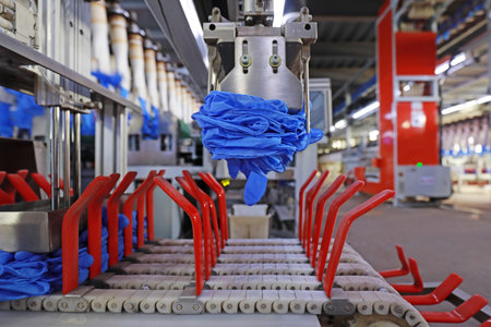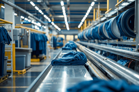 Conveyor belt carrying blue fabric in a textile factory, showcasing the manufacturing process of clothing