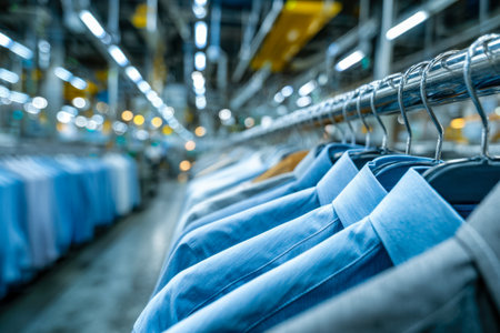 Brightly lit spacious factory floor showcasing organized rows of freshly made denim shirts suspended on metal hangers, emphasizing efficiency and craftsmanship in ap