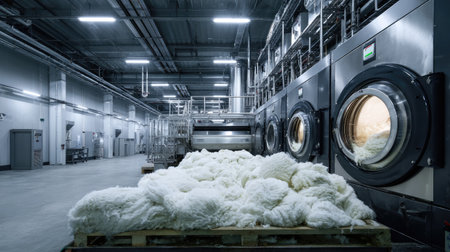 An expansive industrial laundry facility featuring large washing machines lined up alongside a pile of white fabrics. The modern environment emphasizes cleanliness and efficiency in textile processing.