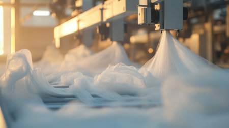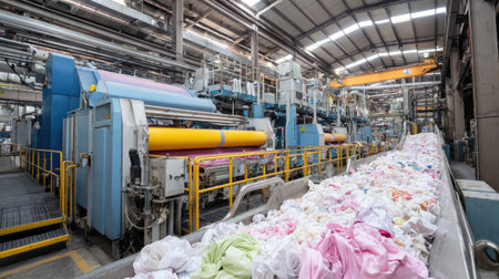 A bustling industrial textile factory showcasing advanced machinery processing vibrant fabric rolls in an efficient production line, highlighting modern manufacturing techniques.