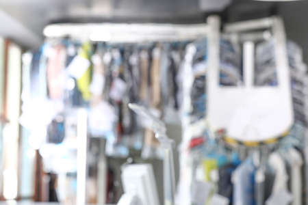 fast-fashion store, with clothes on display and trash bags in the background, created with generative ai