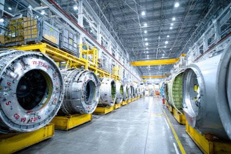 Workers assemble jet engines on a production line in a large aircraft manufacturing plant. The facility features advanced equipment and several ready engines for installation.