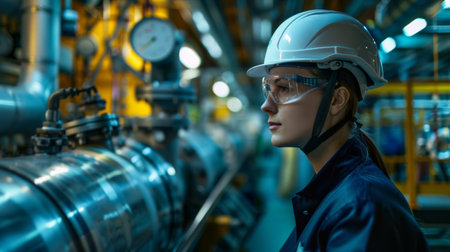 Safety engineer in industrial facility, wearing helmet and reflective vest, overseeing operations in a manufacturing environment.