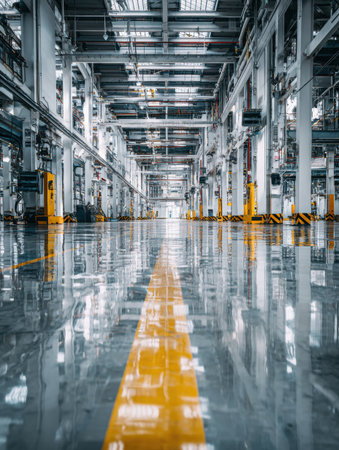Brightly lit industrial facility showcasing a spacious production area. The polished floor reflects overhead lights, while machinery and equipment are neatly arranged along the sides.
