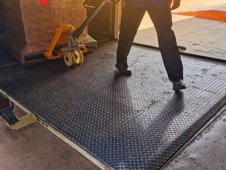 Worker driving forklift loading and unloading shipment carton boxes and goods on wooden pallet from container truck to warehouse cargo storage in logistics and transportation industrial