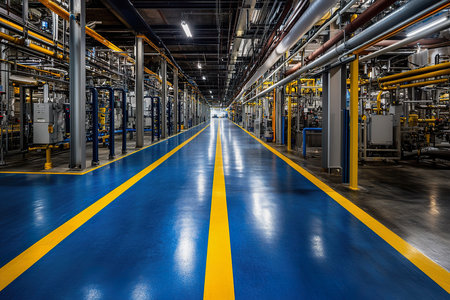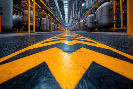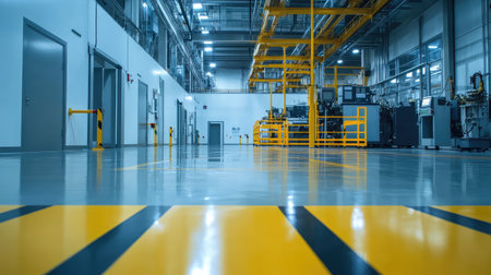 This image showcases an industrial floor with yellow safety stripes in a narrow factory corridor, emphasizing cleanliness and maintenance in a workspace.
