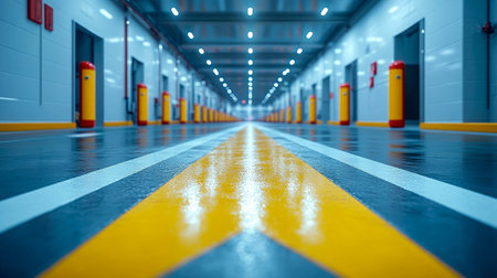 This image features a low-angle view of a sleek industrial corridor, highlighted by yellow safety lines and softened ambient lighting, creating a modern, secure environment.