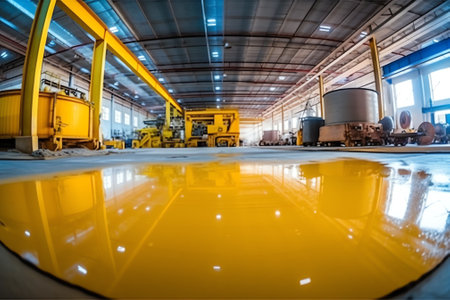 Spacious industrial warehouse filled with machinery and equipment illuminated by bright overhead lights, emphasizing the shiny concrete floor.