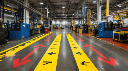 Factory floor with clearly marked safety zones, protective barriers around machinery, and visible warning signs, with an organized and clean background for copy space.