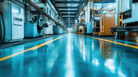 A vibrant, clean industrial factory floor reflecting bright lights, showcasing organized machinery and equipment to enhance production efficiency in a modern manufacturing setting.