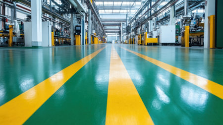 This image showcases a vibrant industrial factory interior with a polished green floor marked by yellow safety lines. The modern machinery lines both sides, highlighting a clean manufacturing environment.
