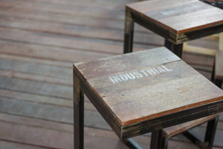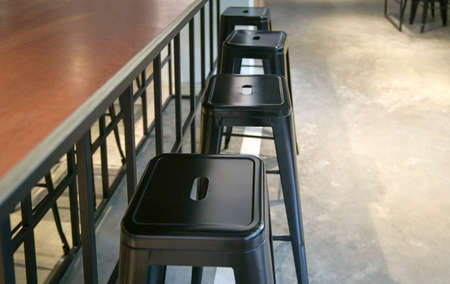 Row of black metal stools next to a wood table in a restaurant. Copy space.