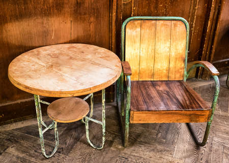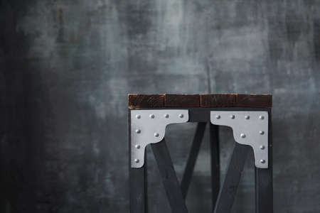Wooden table with metal inserts. Loft style table on the background of a dark wall in grunge and loft style