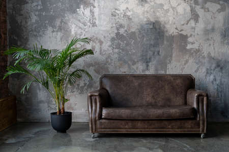 Dark brown leather couch standing in living room with loft interior design. Green houseplant in flower pot near sofa, against concrete copy space wall