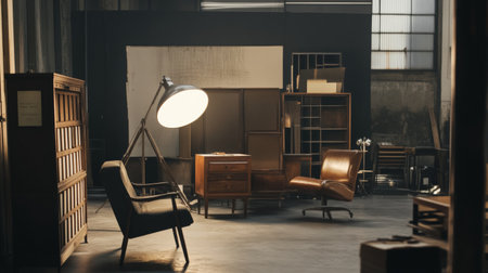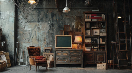 A cozy collection of vintage furniture, including an armchair and a wooden dresser, set against a textured industrial wall with warm ambient lighting.