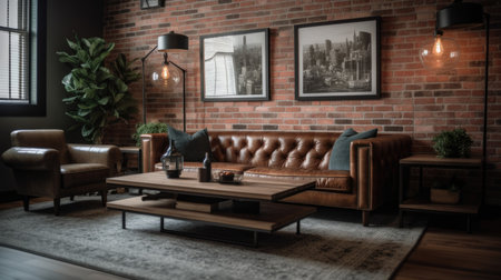 Living room decor, home interior design . Industrial Rustic style with Brick Wall decorated with Metal and Wood material . Generative AI AIG26.