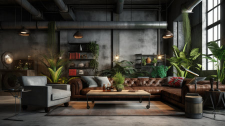 A spacious industrial loft featuring comfortable leather seating, a wooden coffee table, large windows, and abundant greenery, creating a stylish and inviting urban living environment.