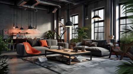 Stylish industrial loft interior featuring modern furniture, warm lighting, and large windows, creating a cozy yet chic atmosphere.