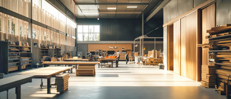 Sunlight streams through large windows, illuminating a workshop bustling with wooden furniture. Various tables and chairs showcase craftsmanship, while a sense of productivity fills the air.