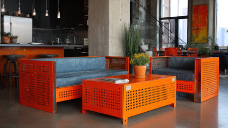 A stylish modern living room showcases bright orange furniture against a sleek backdrop, perfect for anyone looking to enhance their urban living space with unique decor.