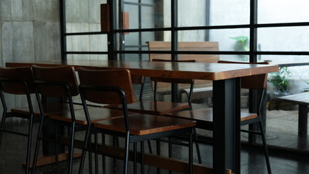 Modern cafe interior with tall windows, concrete floor, with wooden chairs and tables