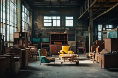 In a dimly lit warehouse, an eclectic array of vintage furniture stands in striking contrast to the peeling walls.