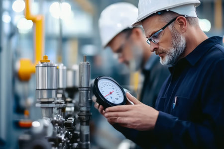 Two experienced engineers meticulously check pressure gauges while monitoring equipment in a bustling manufacturing environment.